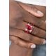 Glittery white rhinestones and glowing red moonstones are sprinkled across the finger, coalescing into a whimsical band. Features a stretchy band for a flexible fit.