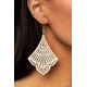Painted in a rustic white finish, a scalloped wooden frame is cutout in airy stenciled details for a whimsical finish. Earring attaches to a standard fishhook fitting.