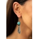 Ribbed in linear textures and dotted in silver studs, an asymmetrical silver plate links to the bottom of a turquoise stone frame for an artisan inspired design. Earring attaches to a standard fishhook fitting.