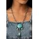 A large turquoise stone encased in a studded silver frame is swings dramatically from a heavy silver chain with oversized links. A collection of turquoise stones wraps around the bottom of the large pendant, with an elongated oval stone swaying below them. Features an adjustable clasp closure.