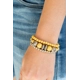 A whimsically mismatched collection of yellow stone beads, plain silver beads, and antiqued floral accents are threaded along stretchy bands around the wrist, creating colorful layers.