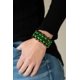 Rows of green wooden beads and brown wooden discs are threaded along stretchy bands that decoratively weave around the wrist, creating a tropical inspired statement piece.