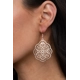 The center of a scalloped rose gold frame is filled with airy floral filigree, creating a whimsical frame. Earring attaches to a standard fishhook fitting.
