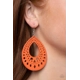 Painted in a vivacious Amberglow finish, a wooden teardrop has been cut into a diamond and triangular stenciled pattern for a tribal inspired flair. Earring attaches to a standard fishhook fitting.