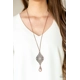 Swirling with whimsical filigree detail, an ornate copper frame swings from the bottom of a lengthened copper chain. A lobster clasp hangs from the bottom of the design to allow a name badge or other item to be attached. Features an adjustable clasp closure.