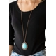 A refreshing turquoise stone teardrop is pressed into the center of an ornate copper frame, creating a dramatic pendant for a seasonal look. Features an adjustable clasp closure.