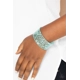 Dainty silvery shavings are encased in a thick blue acrylic cuff, creating an icy incandescence around the wrist.