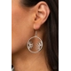 A pair of airy daisies bloom inside a hammered silver hoop, creating a whimsically seasonal display. Earring attaches to a standard fishhook fitting.