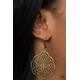 The center of a scalloped brass frame is filled with airy floral filigree, creating a whimsically rustic frame. Earring attaches to a standard fishhook fitting.