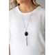 An oversized black cat's eye stone frame gives way to a shimmery silver chain tassel, creating a whimsically stacked pendant at the bottom of a lengthened silver chain. Features an adjustable clasp closure.