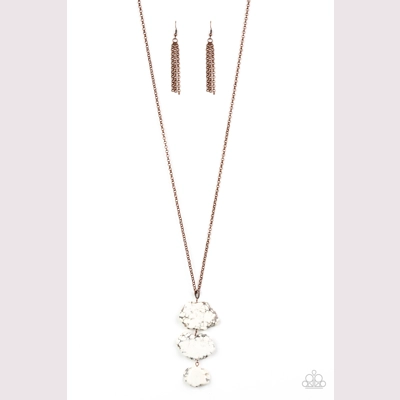 As if chipped off a cliff, pieces of white rock link at the bottom of a lengthened copper chain for an earthy look. As the stone elements in this piece are natural, some color variation is normal. Features an adjustable clasp closure.
