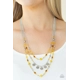 Varying in shape and shimmer, a glittery collection of faceted silver beads, sparkly yellow crystal-like beads, and glassy brown beads adorn three dainty silver chains below the collar. Shimmery silver discs adorn the center of the centermost strand, adding flirtatious movement. Features an adjustable clasp closure.