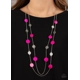 Hammered silver discs and pink shell-like beads sporadically dot two glistening silver chains, creating colorful layers across the chest. Features an adjustable clasp closure.