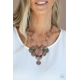 Antiqued copper hoops link with a section of chunky copper chain below the collar. An antiqued collection of copper hoops and hammered brass and copper discs cascade from the bottom of the rustic display, creating a noisy fringe. Features an adjustable clasp closure.