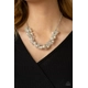 A royal collection of classic white pearls and glassy crystal-like beads swing from the bottom of a dainty silver chain, creating a glamorously clustered fringe below the collar. Features an adjustable clasp closure.