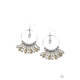 Decorative silver and brass beads swing from the top and bottom of an ornate silver hoop, creating a tribal inspired fringe. Earring attaches to a standard fishhook fitting.