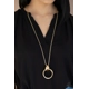 Trios of exaggerated gold rings link at the bottom of a lengthened gold chain, creating a dramatic industrial pendant. Features an adjustable clasp closure.