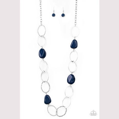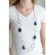 Featuring a faux rock finish, faceted blue beads join hammered silver hoops across the chest for a seasonal look. Features an adjustable clasp closure.
