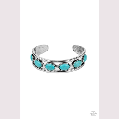A refreshing collection of oval turquoise stones are studded across the airy center of a layered silver cuff for a rustic flair.