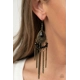 Dotted with glittery black rhinestones, antiqued brass chains stream from the bottom of a brass filigree embossed teardrop, creating a whimsical fringe. A teardrop black rhinestone dots the frame for a dazzling finish. Earring attaches to a standard fishhook fitting.