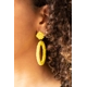 A sunny collection of dainty yellow seed beads are woven around a circular frame at the bottom of a matching beaded fitting, creating a colorful hoop. Earring attaches to a standard post fitting.