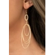 Increasing in size, shiny gold ovals ripple out from the bottom of interconnected flat shiny gold frames, creating a layered lure. Earring attaches to a standard fishhook fitting.