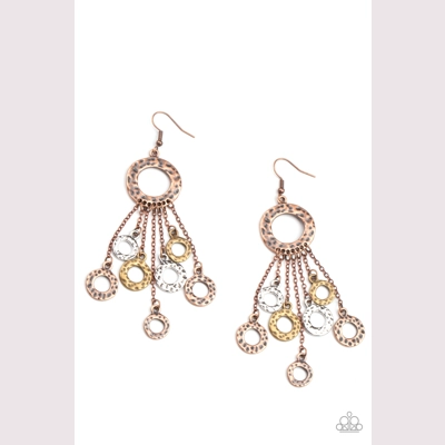 Attached to dainty copper chains, a fringe of hammered brass, copper, and silver rings swings from the bottom of a hammered copper ring for a noise-making statement. Earring attaches to a standard fishhook fitting.