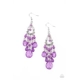 A glassy collection of purple teardrop, oval, and round crystal-like beads taper at the bottom of a silver half moon frame that is suspended by dainty silver chains. Matching beading swings from the top of the frame, creating a whimsical chandelier. Earring attaches to a standard fishhook fitting.