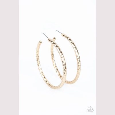 Hammered in blinding shimmer, a thick gold hoop curls around the ear for an edgy, urban look. Earring attaches to a standard post fitting. Hoop measures approximately 2" in diameter.