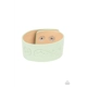 The front of a Green Ash leather band is stamped in a decorative butterfly and flower pattern, creating a whimsical display around the wrist. Features an adjustable snap closure.