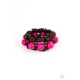 Oversized pink wooden beads, rustic brown wooden beads, and dainty wooden discs are ornately threaded along braided stretchy bands around the wrist, creating a summery centerpiece.