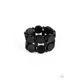 Earthy black wooden discs and beads are threaded along braided stretchy bands around the wrist, creating a summery display.