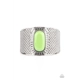An oversized faceted green bead is pressed into the center of a thick silver cuff embossed in diamond-like textures, creating a bold tribal inspired centerpiece around the wrist.