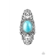 Dotted with a refreshing turquoise stone center, glistening silver filigree climbs the finger, coalescing into a dramatic frame. Features a stretchy band for a flexible fit.