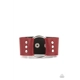 An oversized silver hoop is studded in place between the center of studded pieces of red and black leather, creating a rustic centerpiece around the wrist. Features an adjustable snap closure.