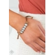 Featuring brass pronged fittings, a row of oval and teardrop opal white beads delicately connects into a solitaire frame. The ethereal centerpiece is knotted in place with rows of shiny brown cording, creating a whimsically rustic display around the wrist. Features an adjustable sliding knot closure.