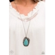 A silver feather, palm leaf, and dainty silver flower overlap atop an oversized turquoise stone teardrop that is nestled inside a textured scalloped frame, creating a refreshing pop of color at the bottom of a lengthened silver chain. Features an adjustable clasp closure.