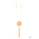 A dramatic gold chain tassel swings from the bottom of an oversized shell-like acrylic disc, creating a fabulously stacked pendant at the bottom of a lengthened gold chain. Features an adjustable clasp closure.