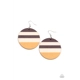 The front of a shiny wooden disc is stripped in purplish-brown and yellow accents, creating a colorful summery look. Earring attaches to a standard fishhook fitting.