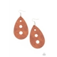 The front of a distressed leather teardrop frame is adorned into three shimmery silver paint drops, creating a rustic elegance. Earring attaches to a standard fishhook fitting.