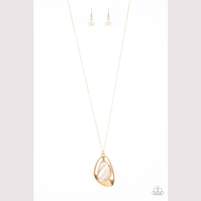 A glowing white cat's eye stone is nestled inside an asymmetrical gold frame, creating a colorful pendant at the bottom of a dainty lengthened gold chain for a whimsical flair. Features an adjustable clasp closure.
