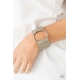 An oversized silver hoop is studded in place between the center of studded pieces of gray and black leather pieces, creating a rustic centerpiece around the wrist. Features an adjustable snap closure.