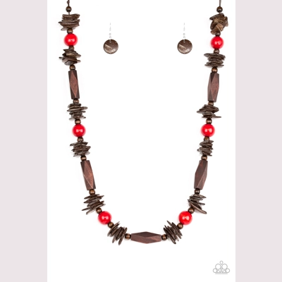 Featuring round, faceted, and distressed finishes, mismatched brown wooden beads are threaded along shiny brown cording. Fiery red wooden beads trickle between the earthy accents, adding a colorful finish to the summery palette. Features an adjustable sliding knot closure.