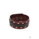 Thick black leather laces zigzag across the front brass studded brown leather band, creating a rustic display around the wrist. Features an adjustable snap closure.