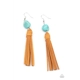 A rustic brown suede tassel swings from the bottom of an imperfect turquoise stone, creating an earthy centerpiece. Earring attaches to a standard fishhook fitting.