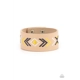 Yellow, blue, and white thread is stitched across the front of a brown leather band, creating a colorful tribal inspired pattern. Features an adjustable snap closure.