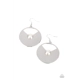 Dotted with a white pearl center, a slice of metal has been removed from an oversized silver disc for a retro effect. Earring attaches to a standard fishhook fitting.