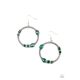 Featuring round, oval, and square cuts, a collection of glittery green rhinestones haphazardly adorn the front of a textured silver hoop, for a gritty-glamorous look. Earring attaches to standard fishhook fittings.