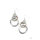 Featuring an antiqued beveled center, warped brass and silver rings asymmetrically connect into a rustic lure. Earring attaches to a standard fishhook fitting.