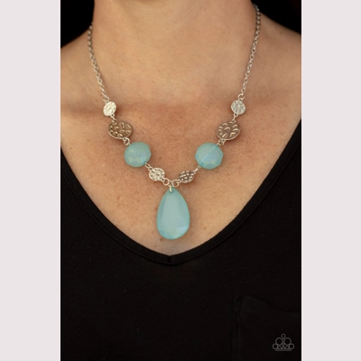 A dewy Cerulean teardrop swings from the bottom of interlinking hammered silver discs and matching dewy Cerulean crystal-like beads, creating a dreamy display below the collar. Features an adjustable clasp closure.